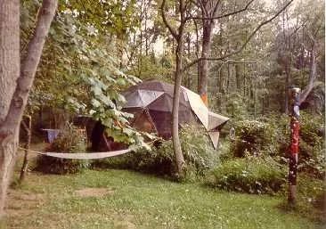 The Dome is an impressive architectural achievement. Goldfield assembled master carpenters, stone masons, backhoe operators. The build & times story with audio visuals appears later .Among the builders Ron Rozewski -laid the field stones for the 38 foot sphere’s foundation 2 to 8 feet high due to slope,2 feet into the ground, AND the brick floor. Jim Croce paid for the electric line from road to Dome, Leroy Brown, star backhoe ,bulldozer guy dug out the the 4 fee foundation for all around,& cleared the road through the forest…. Ziggy, John Weimeyer, Henry Brann built the triangles, and floor etc etc n so forth.